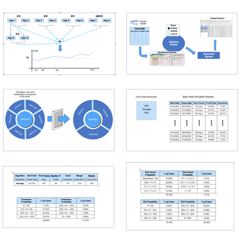 1- Our FX Algorithms are built around creative ideas targeting a realistic profit inline with clients’ risk tolerance and time constraints. Two Algorithms per currency pair generate trend and hedge signals to mitigate risks related to trend reversal and pullback.